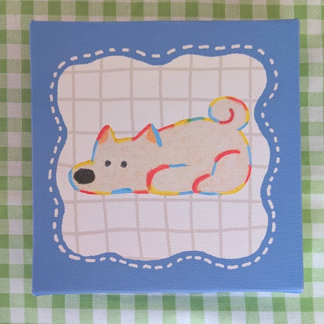 真っ白な北海道犬をクレヨンで描き、キャンバスアートに仕上げました。