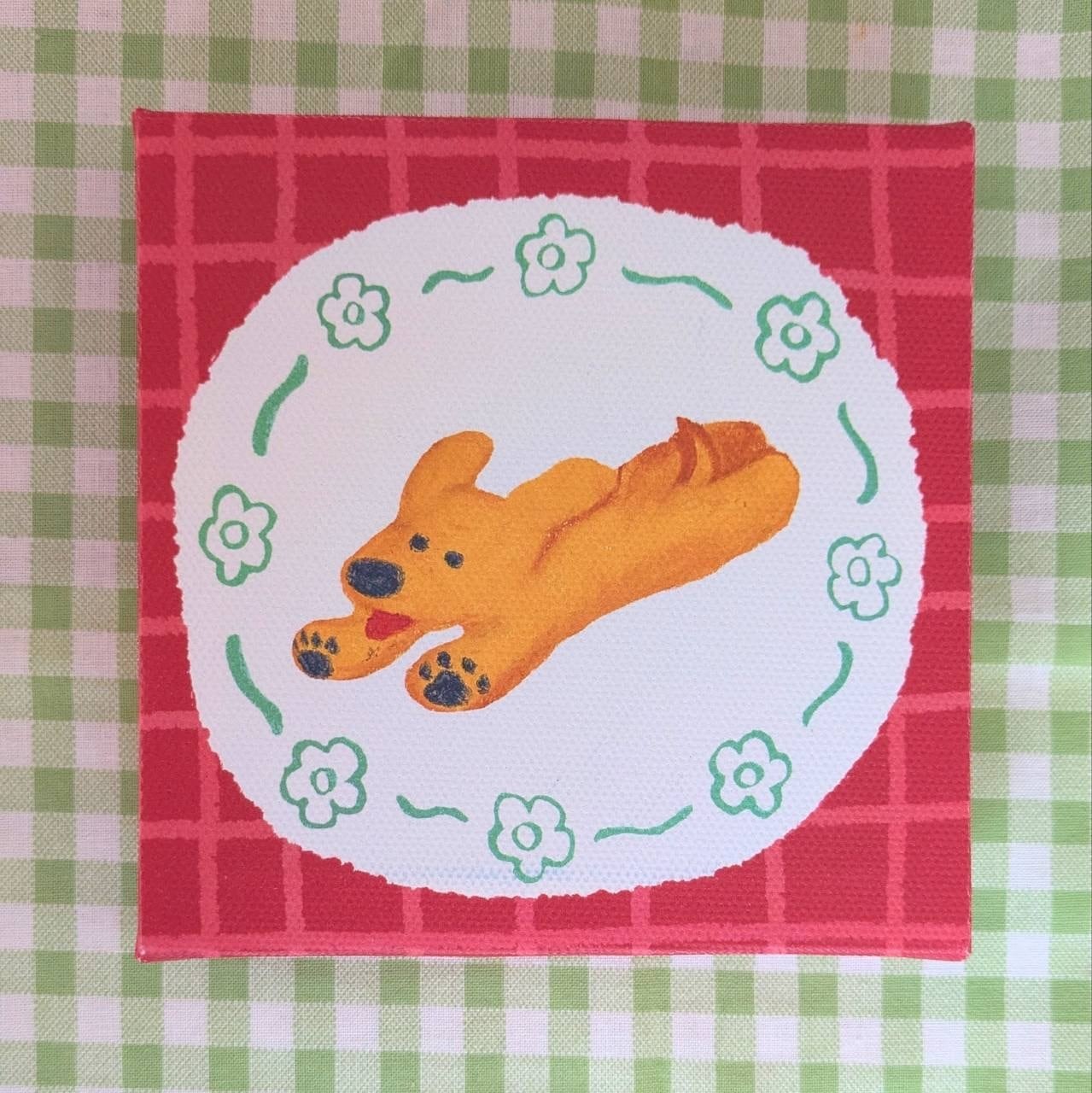 元気に走る子犬をクレヨンで描き、キャンバスアートに仕上げました。