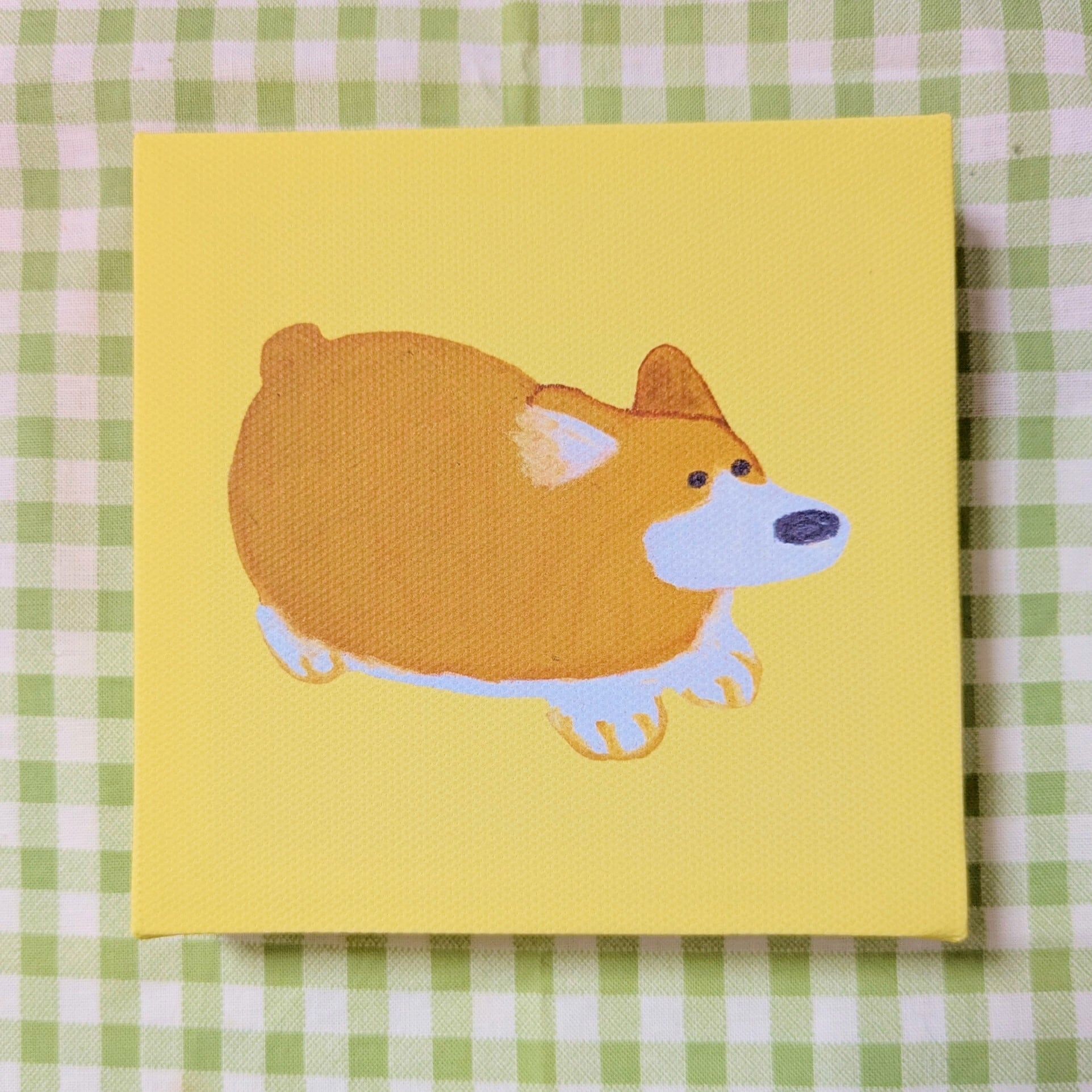まんまるなコーギーをクレヨンで描き、キャンバスアートに仕上げました。